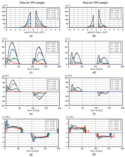 Evaluated amplitude and phase distributions of PD data for TP1 and TP2 samples: (a) and (b) number of PD pulses vs. apparent charge n(q); (c) and (d) phase distribution of the number of PD pulses n(ϕ); (e) and (f) phase distribution of the total charge Σq(ϕ); (g) and (h) phase distribution of the average charge Qav(ϕ). All data normalized per second.