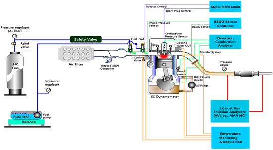 The injectors at the intake manifold for each engine cylinder were replaced with a gas fuel injector at the same position as the existing gasoline fuel injector. Since a fully commercialized injector (high-pressure injectors for direct injection of hydrogen, HOERBIGER ValveTec GmbH) for hydrogen fuel is not commercially produced anymore, at the time of the experiment, a natural gas injector (NGI2, Bosch) for a passenger car engine was used. This gas injector could operate at an injection pressure of approximately 0.7 MPa. The leakage was always checked before and after the experiment, since there was a possibility of leakage when the long contact with the hydrogen fuel continued. Figure 1 shows a schematic diagram of the engine setup and the control/data acquisition system. A hydrogen leak detector and an automatic gas pipe shutoff valve were installed in preparation of hydrogen fuel leaks.