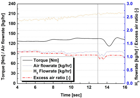 Torque, airflow, hydrogen flow, and excess air ratio changes in time with gradual increase in hydrogen fuel input.