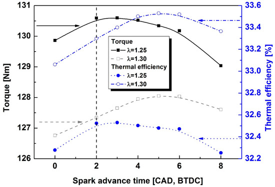 First, the change of the torque and efficiency according to the change of the ignition time at the excess air ratios of 1.3 and 1.25 was investigated under the condition by which the opening time of the intake valve and the exhaust valve were fixed. As mentioned above, because of the WOT condition without throttling, the flow rate of the total amount of hydrogen and the air mixture did not change, while the excess air ratio changed as the supplied hydrogen fuel flow rate changed. The maximum brake thermal efficiency is shown in Figure 3, where it can be seen that, at the excess air ratio of 1.3, the torque was the highest at the spark advance time of five CAD before the top dead center (BTDC). However, at the excess air ratio of 1.25, which is a relatively richer mixture condition, the maximum efficiency and torque could be observed at three CAD BTDC, which is maximum brake torque (MBT) spark advance time. Although the burning rate is slightly slower in the relatively leaner mixture condition, as shown in Figure 4, it shows higher thermal efficiency because of higher air utilization rate and lower heat loss proportional to the combustion temperature. [18,25].