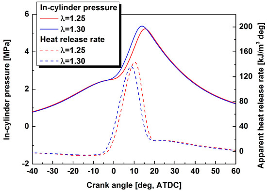 In-cylinder pressure and apparent heat release rate traces with maximum brake torque (MBT) spark advance time at excess air ratios of 1.25 and 1.30.