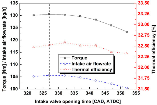 The influence of changing the valve opening time at the excess air ratio of 1.25, which can stably obtain higher torque, was investigated. Figure 5 describes the changes in torque, intake airflow rate, and efficiency when the opening time of the exhaust valve was fixed at 161 CAD ATDC with an excess air ratio of 1.25, and as the opening time of the intake valve changed. The opening and closing time of the intake valve affects the performance of the engine in relation to the volumetric efficiency, which represents the mass of the actual air that is introduced into the cylinder equivalent to the piston displacement. It is general, to advance the opening timing to a BTDC point so that as much intake air as possible can be introduced, since the flow rate of the intake air is not fast at low engine speed [26,27].
