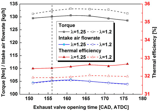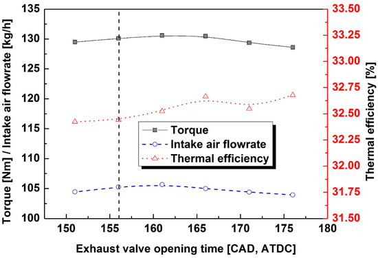 - When the opening time of the exhaust valve was retarded, the intake airflow rate and the torque decreased. However, the torque and thermal efficiency decreased when the opening time of the exhaust valve advanced excessively due to the increased pumping loss.