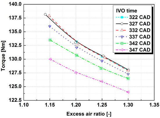 The opening time of the exhaust valve was fixed to 161 CAD ATDC and the results of the torque were observed with the excess air ratio and intake valve opening time variations in Figure 8, since the torque change with respect to the change of the opening time of the exhaust valve was not greater than that observed when the opening time of the intake valve was changed.