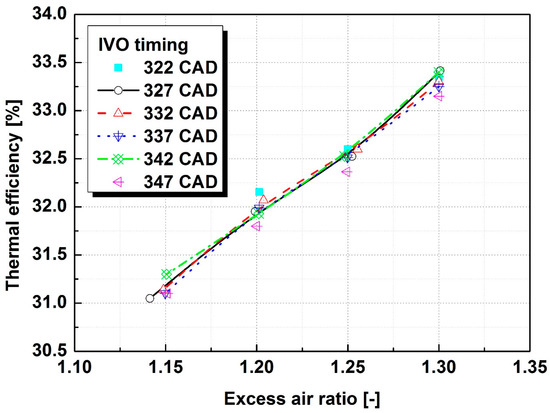 When the stable operation is secured at the lowest excess air ratio of 1.14, the highest torque of 138.1 Nm results was obtained at the intake valve opening time of the 327 CAD condition. Moreover, similar results were obtained under the 332 CAD conditions. However, under a condition that was more retarded than the 332 CAD condition, the torque decreased as the intake valve opening time was retarded. Because of backfire, it became impossible to operate the engine under a condition of a relatively richer mixture, as compared to the condition where the excess air ratio was 1.15. In the case of advancing to 327 CAD or less, the torque was similar to the result that was obtained at 332 CAD, since this did not significantly affect the intake air amount. However, if the intake valve opening time advanced excessively, as was the case under the 322 CAD condition, the combustion gas, which was hot and not exhausted from the cylinder, was in contact with the hydrogen-air mixture and it generated the high probability of a local combustion high. Therefore, it was more difficult to operate the engine with a richer mixture, as compared to the excess air ratio of 1.20. Even when the rich mix was fed with the addition of hydrogen fuel at a retarded intake valve opening time, the results indicated that the torque value was proportionally low to the advanced condition. However, even when the opening time of the intake and the exhaust valves were controlled, it was not possible to obtain a stable operating condition under which backfire would not occur with a relatively rich mixture condition near the excess air ratio of 1.1. Generally, torque and thermal efficiency are significantly influenced by the excess air ratio, but the changing intake valve opening time does not affect the thermal efficiency, as shown in Figure 9, since the variation of the total amount of hydrogen/air mixture scarcely influence the combustion speed at a certain excess air ratio condition.