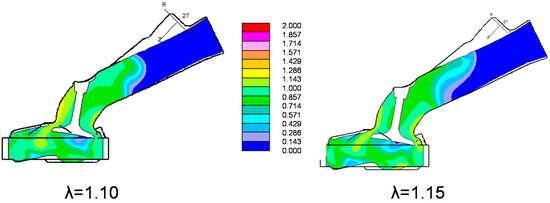 Simulated spatial distribution of equivalence ratios when piston and valve movements were at 40 CAD ATDC with excess air ratios of 1.1 and 1.15.