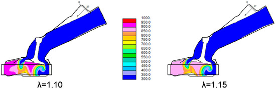Simulated spatial distribution of temperature in Kelvin when piston and valve movements were at 40 CAD ATDC with excess air ratios of 1.1 and 1.15.