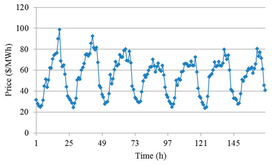 (3) The number of tax rate values can be set according to the actual requirement. If the number of tax rate values is too small, pollution levels cannot be well-distinguished. If the number of tax rate values is too large, it is inconvenient to implement carbon-tax policy. As a tradeoff between the two aspects, the number of tax rate values is set as five in the experiments. Based on the range of emission intensity, is set to 0.1m and wm is set to mΔ, in which tax-rate increment Δ is set to 15 without loss of generality in the first part of the experiments; its value is discussed in the second part of the experiments. In practice, tax-rate value wm can be set in other form according to the requirements. We use Pennsylvania–New Jersey–Maryland (PJM) Interconnection Real Time data from 2005 to 2006 [34] to estimate electricity prices. The estimated price data for 168 h are presented in Figure 2. A ten-piece piecewise linear function is used to approximate each fuel cost function.