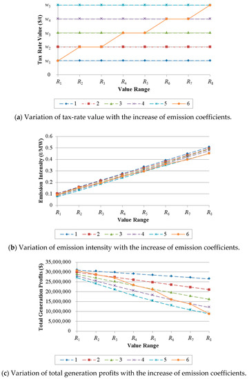 Variations of tax-rate value, emission intensity, and total generation profits with the increase of emission coefficients. Curves 1, 2, 3, 4, and 5 depict the results corresponding to the carbon-tax policy with constant tax rate , , , , and , respectively; Curve 6 depicts the results corresponding to the proposed carbon-tax policy.
