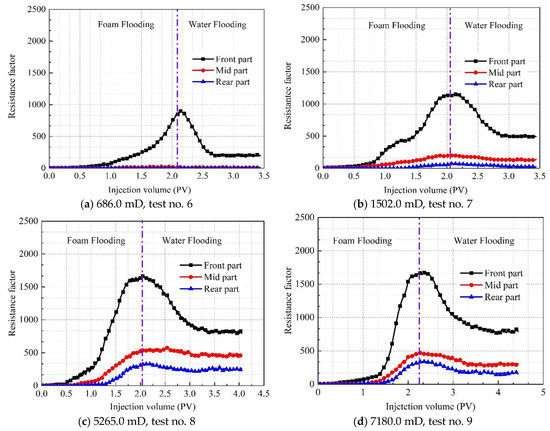 The effect of the gas–liquid ratio on the resistance factor during foam flooding and follow-up water flooding is depicted in Figure 13. In the foam flooding period, the resistance factors increase gradually with the injection of the clay-HY-2 foam and then reach a plateau. In the follow-up water flooding period, the resistance factors decrease slightly and then remain at a certain level. From Figure 13a–c, the overall resistance factors in sandpacks decline as the gas–liquid ratio increases, i.e., the relatively low foam quality facilitates the plugging effect in porous media. This trend coincides with conclusions in the literature [29]. Compared with previous works under the same gas–liquid ratio, the resistance factor of clay-HY-2 foam in this study is five to ten times higher than those of traditional foams [30,31]. However, the difference among resistance factors of various parts is large in Figure 13a, and the extra high resistance factor at the front part of the sandpack means that most bubbles and clay particles assemble at the entrance of the sandpack. In such a situation, the deep profile control of the foam is limited. While in Figure 13b, c, the curve of the front part of the sandpack is approximate to curves of other parts, which means that the clay enhanced foam moves into the deep part of the sandpack and has a relatively uniform plugging effect on the whole sandpack.