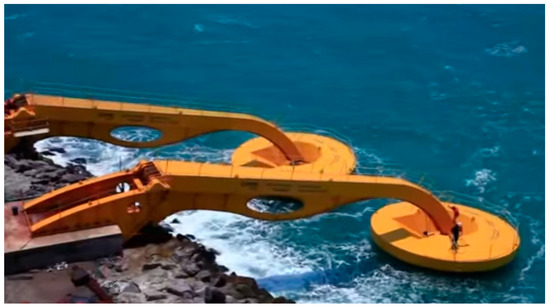 An example of WAB device is the Eco Wave System [24]. This system draws energy from wave power throughout uniquely shaped floaters, which rise and fall with the up and down motion, lifting force, change of water level, hydraulic air lock, and incident flux of waves. The floaters are attached by robust arms to any type of structure, such as (but not limited to) breakwaters, jetties, piers, poles, and floating and fixed platforms. The motion of the floaters, is transmitted to a shore located power station, which converts the energy from this motion into fluid pressure, which spins a generator, producing electricity. There are two variants of this system, the ‘Wave Clapper’ and the ‘Power Wing’ (Figure 3).