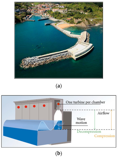 Mutriku generation plant [30]. (a) OWC Mutriku Power Plant. (b) System schematic.