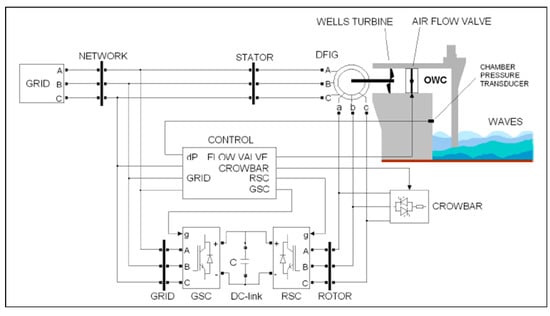 A well-known OWC system is the Mutriku power plant in Spain. The converter is 100 meters long and composed of 16 capture chambers—each of which has in the upper hole, a turbo-generator group with 18.5 KW of nominal power, producing a total power of 296 kW [28]. When built, it was the first installation of its kind in Europe (Figure 6). The installation uses fixed-pitch Wells turbines, which give it simplicity and robustness. The turbo-generator unit, installed vertically, has a butterfly valve at its bottom to isolate the chamber if necessary. The dimensions of the turbine (2.83 m high and 1.25 m wide) and its weight of approximately 1200 kg, simplify assembly and disassembly operations. In the electrical configuration of the plant, the 16 turbines are separated, for better control, into two groups of eight. As indicated in [29], each turbine is controlled by considering the pressure inside the chamber, in order to set the speed of rotation and optimize the extracted power (Figure 7).