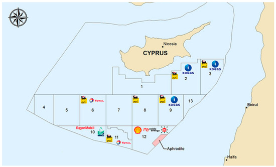 Cyprus is a small insular EU member Country located in the southeastern Mediterranean. The energy system of the island is based on imported oil-fired electricity generation with a limited contribution of renewable energy sources such as solar, wind and biomass [1,2]. Recently, offshore hydrocarbon explorations have detected natural gas reserves in the “Aphrodite” Natural Gas Field. Furthermore, other licenses have been granted to international Oil and Gas companies and related hydrocarbon prospection activities in other areas, within the island Exclusive Economic Zone (EEZ), are underway [3]. Figure 1 presents a map of the exploration blocks that the Country has established and the corresponding licensees [4]. These local energy sources exploitation could increase incomes and strengthen the energy supply security [5] for Cyprus. Such context could be a force for moving toward the economic and welfare growth of the island.