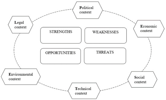 The PESTEL (or PESTLE) analysis is a popular tool that helps to consider the political, economic, social, technical, environmental and legal environment of an organization to identify the external environment or issues that could have an impact on its operations [45]. The SWOT analysis is a strategic analysis tool, which combines the study of the strengths and weaknesses of an organization, territory or sector with the study of the opportunities and threats in its environment [46]. The combination of them is suitable to analytically imprint and evaluate the situation of a sector. The PESTEL analysis results to an extensive description of the context and all the factors influence the situation under study. Consequently from the SWOT analysis emerges the internal and external issues that either must be enhanced, when they are strengths or opportunities, or mitigated when they are weaknesses or threats (Figure 2).