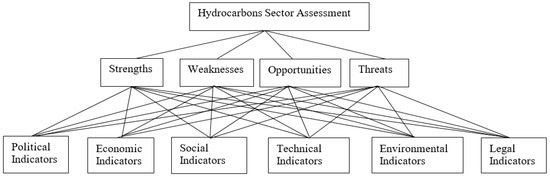 Saaty’s AHP multi-criteria decision-making method proposes to structure an evaluation problem into a hierarchical model [47,48]. Accordingly, Cyprus’ hydrocarbon sector evaluation problem was proposed to be analyzed as presented in Figure 3.
