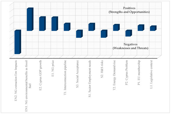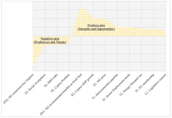 According to the above results, the primary qualitative analysis emerges that Cyprus’ hydrocarbon sector could be sustainable. In the framework of the formed indicators evaluation, it obviously presents more positives than negatives. The quantification process verifies this result also. Detected sector strengths and opportunities are more than the weaknesses and threats, and the total area they occupy, as presented in Figure 6, is more extensive.