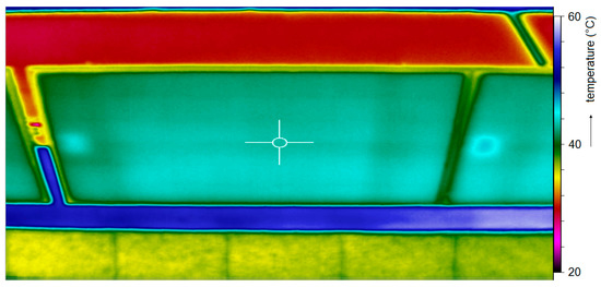 Figure 3 shows a typical PV panel image (bird view) from the infrared camera. The pictures of all other PV panels were very similar during the monitoring. It is evident that the temperature distribution is homogeneous with values around 45 °C throughout the PV panel (at about 10 a.m.). There are no places with significantly increased temperature. The slightly increased temperature on the left side of each PV panel is not a fault, but it corresponds with the location of the box with the contact pins on the back of the panel. In this place, the PV panel is not cooled as much as other locations. This indicates that the PV panels have no apparent significant damage and perfect operation is expected. By comparing Figure 3 with Figure 1, it is apparent that the roofing is warmest at the area of impact of direct solar radiation (about 55 °C) while light tiles reflect more radiation and they are therefore a bit cooler. In the area that is shaded by the PV panels, the roof temperature is about 30 °C.