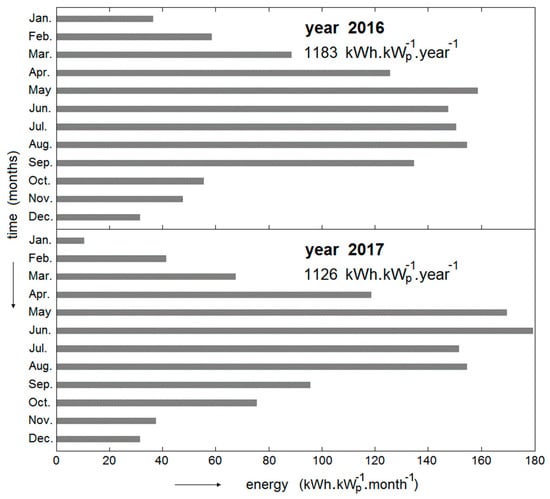 The premise of the flawless operation corresponds to our data analysis from the Solarmon monitoring system. Figure 4 shows the generation of the electric energy in 2016, which is the first year of operation of the PV power plant. The comparison of the measured values with the assumption according to the internationally used PV GIS application [18] shows that the annual electric energy production is actually about 20% higher than the expected value. A more detailed breakdown of monthly values is provided in Table 1. The amount of the produced electric energy exceeds expectations, and it is the most important indicator of the quality of the PV system. All significant defects would immediately lead to a reduction in these values. In this case, our monitoring system would immediately report a suspected malfunction.