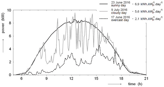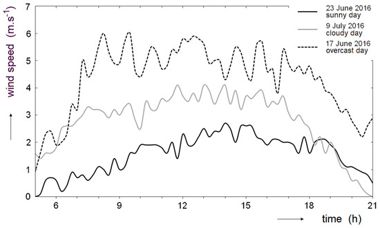 Figure 5 shows the dependence of the instantaneous power relative to time during the three selected days at the turn of the spring and summer of 2016. We chose the sunny, cloudy, and overcast days. The daily values of the electric energy production are also presented and they correspond to the area under the graph as it applies , where E is the generated electric energy, P is the instantaneous power, and t is the time. When comparing the sunny and cloudy days, the local maxima on the instantaneous power curve are higher during a cloudy day. This is related to the lower temperature of the PV panels. With an increase in temperature, the Fermi energy level moves from the edge to the center of the forbidden band in the band structure of energy levels of the semiconductor. This effect is based on the physical theory of solids. This reduces the potential barrier at the PN junction in the semiconductor PV cells. The reduced potential barrier decreases the photovoltaic voltage and consequently the generated power. The theoretical physical justification for this phenomenon was published in a previous work [19]. During a cloudy day, the temperature of the PV panels is lower because most of the energy supply is obtained from direct solar radiation, and during the shading of the sun, this energy does not fall. The resulting temperature is always reliant on the balance between received energy and the energy transmitted by radiation, heat conduction, and air flow. If the sun is suddenly out from behind clouds during the cloudy day, the temperature of the PV panels is lower at the beginning. According to the physical theory, the instantaneous power increases by about 0.5% when the temperature of the PV panels decreases by 1 °C. Figure 5 shows that during the relatively cloudy day of 9 July 2016, the maximum power output after the clouds suddenly disappeared was 15% higher than on a cloudless day (23 June 2016). PV panels were intensively cooled due to the higher wind speed during the cloudy day of 9 July 2016 (see Figure 6) and the air temperature was around 24 °C in the afternoon. On the other hand, the temperature of the air was around 31 °C in the afternoon during the clear skies day of 23 June 2016. The temperature differences in the PV panels between these days reached up to about 30 °C. The PV panels had a temperature of about 25 °C when they were shaded on 9 July. A temperature of about 53 °C had PV panels that were illuminated by direct solar radiation on 23 June. The temperatures of the PV panels were measured only by an infrared camera, but the measured values correspond well to the theory of solids.