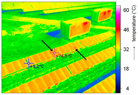 Using the drones and an infrared camera to monitor the defects of the PV power plant is relatively simple, fast, and operational but only serves as an approximate control of the state of the PV panels. However, the ability of the quick detection of the worst defects is the main advantage. Cracked PV cells with broken contacts are the worst defects. It can be seen (Figure 3) that our above-mentioned PV power plant does not have any significant flaws. We suggested the use of drones to monitor parameters [20]. This method is appropriate if there is limited access to the building-integrated PV power plant, such when it is located on the roof or the facade. Figure 7 shows a similar image from a larger PV power plant in Ladná as an example. We can see two damaged hot spots on the PV panels in the central part of the image. In the background, we can see the ventilation of the heat released by the inverters.