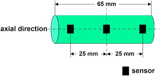 The constant-current constant-voltage (CCCV) charge/discharge measurements were performed on the battery cell test system (BK-6808, Mingyu Equipment Co., Ltd., Shenzhen, China). First, two CCCV cycles of the cells at 0.2 C were conducted at normal temperature (25 °C) to obtain their state of health (SOH). Then, the cells were transferred to an environment chamber (FB-WGD4010, Hongyun Equipment Co., Ltd., Shanghai, China) to rest 10 h at a specified temperature. After that, the cells were charged at a specified rate to 4.2 V and maintained at 4.2 V until the charging current dropped below C/20. The surface temperatures of the cells during charging were measured by three DS18B20 digital temperature sensors (Sinachip Electronics Co., Ltd., Nanjing, China) and the three sensors were placed along the axial direction of a battery cell, as shown in Figure 1. For the cyclic aging, the test protocol was in accordance with that presented above. The aging was interrupted after every cycle for the SOH test at normal temperature (25 °C). After low-temperature charge, the cells were kept at room temperature for 24 h until their temperature restore to room temperature, then a digital voltmeter (34411A, Keysight Technologies, Santa Rosa, California, USA) was used to measure their ohmic resistance.
