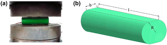 To obtain mechanical behavior of an 18650 LIB cell, the cylindrical cell body was considered as a whole frame (Figure 2b). A rather simple but useful method was used to convert the loading force–displacement curve obtained by compression into the nominal relationships between stress and strain, and between modulus and strain [11,12,15]. Nominal stress can be expressed as: