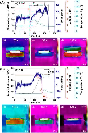 (a) The nominal stress-time, nominal modulus-time, voltage-time, and surface temperature-time curves in compression of the 18650 lithium-ion battery cells charged at −25 °C, and (b–d) their time-stamped thermal images: the cells (A) at 0.5 C and (B) at 1 C.