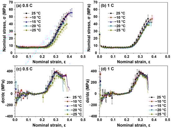 Figure 4 presents the nominal stress-strain and nominal modulus-strain curves of the cells charged at various environmental temperatures and rates. The nominal stress-strain curves of the cells charged at 0.5 C and 1 C were presented in Figure 4a,b, respectively. It could be seen from the two figures that at the same strain, the lower the charge environment temperature of the cell, the lower its load stress was.