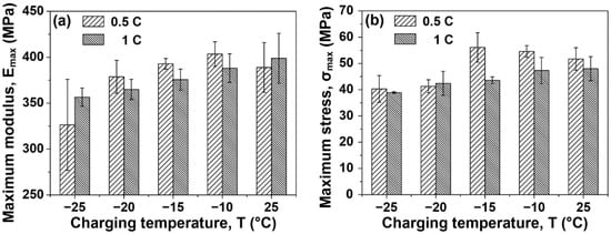 Relationships between the charging environmental temperatures and charging rates of 18650 LIB cells and their (a) maximum nominal moduli Emax and (b) maximum load stresses σmax.