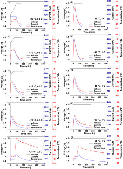 Figure 6a–j, respectively, display voltage-time current-time and surface temperature-time curves of 18650 LIB cells during charging at 0.5 C and 1 C. At 0.5 C, comparing the voltage-time curves obtained at various environmental temperatures, we could find that the constant-current (CC) period at low temperatures became shorter than that at normal temperature. The lower the environmental temperature, the shorter the CC period was. It was because the severe electrochemical polarization and concentration polarization at low temperatures made the cells reach their charge cut-off voltage prematurely, and the lower the environmental temperature, the more severe the polarization was [26,27]. Specifically, the voltage curve of the cell at −15 °C showed a fluctuation in its initial stage of charging, which was caused by the generation and mitigation of cell polarization. This was also the cause of the appearance of a small fluctuation in the voltage curve of the cell at −20 °C. At −25 °C, the CC period disappeared in the voltage-curve of the cell, indicating that its polarization was intensified. It was worth noting that the current curve of the cell charged at −25 °C had two peaks, and at its second current peak the surface temperature rise of the cell was much higher than those of the other cells. Therefore, it could be concluded that the first current peak resulted from the mitigation and generation of the cell polarization, and the second current peak was caused by the generation and mitigation of the cell internal short circuit. For the cells charged at 1 C, their voltage curves almost had no CC period during low-temperature charging. It suggested that the polarization of the cells charged at 1 C was more serious than those charged at 0.5 C. Fluctuations in the current curves of these cells were also caused by the generation and mitigation of cell polarization. Observing the surface temperature and current curves of all the cells during charging, we found that the surface temperature of a cell always changed with its charging current.