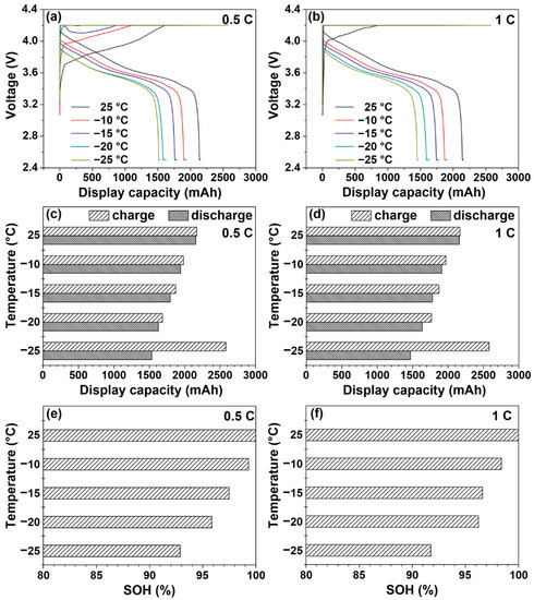 Charge curves at various environmental temperatures (a) at 0.5 C and (b) at 1 C, and discharge curves at 25 °C at 0.2 C of 18650 lithium-ion battery cells. Final charge and discharge display capacity of these cells: (c) at 0.5 C and (d) at 1 C. The state of health (SOH) for these cells after charging: (e) at 0.5 C and (f) at 1 C.