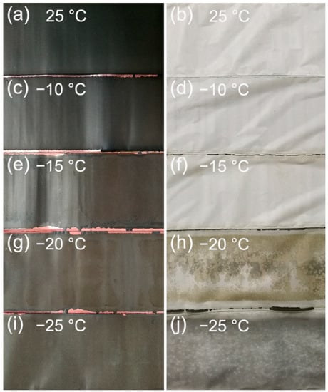 Photographs of the anode surfaces (left side) and separator surfaces (right side) dismantled from the 18650 lithium-ion battery cells after charging at 1 C, and the environmental temperatures were set to (a,b) 25 °C, (c,d) −10 °C, (e,f) −15 °C, (g,h) −20 °C and (i,j) −25 °C.