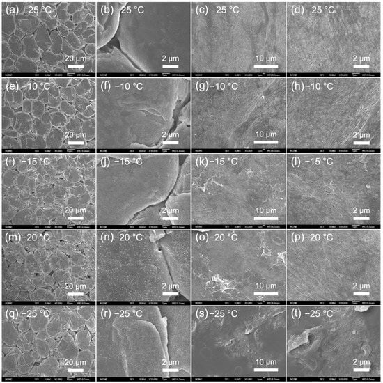 Field emission scanning electron microscopy (FESEM) images of the anode surfaces (left side) and separator surfaces (right side) dismantled from the 18650 lithium-ion battery cells after charging at 1 C, and the environmental temperatures were set to (a–d) 25 °C, (e–h) −10 °C, (i–l) −15 °C, (m–p) −20 °C and (q–t) −25 °C.