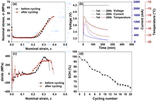 (a) Nominal stress–strain curves, (b) voltage–time, current–time and surface temperature–time curves, and (c) nominal modulus–strain curves of the 18650 lithium-ion battery cells before and after cycling at −20 °C and 0.5 C. (d) The SOH of the cells during the cycling.