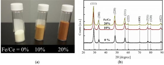 A flame spray pyrolysis (FSP) process was implemented to synthesize Fe–CeO2 nanoparticles. A detailed description of the experimental setup can be found in Reference [40]. Methane (purity 99.995%) was mixed with oxygen (O2; purity 99.9995%), for the pilot flame; whereas oxygen at 8 bar was used as the dispersion gas in the spray nozzle for precursor atomization. Ferrocene (Sigma–Aldrich, St. Louis, MO, USA, 98%) dissolved in m-xylene (Sigma–Aldrich, 99%) was mixed with Ce (III) 2-ethylhexanoate (Sigma–Aldrich, 99% purity) and was used as the precursor for Fe–CeO2 nanoparticles. Ferrocene was added to Ce (III) 2-ethylhexanoate with various concentrations to obtain Fe-doped CeO2 nanoparticles with 10 and 20 atom % of iron with respect to the molar percentage of CeO2. The precursor was injected using a syringe pump directly into the spray nozzle. Synthesized nanoparticles were collected on a glass-fiber filter with the aid of a vacuum pump. Figure 1a shows that doping iron in the CeO2 nanoparticles changes the color from yellow to brown with and increase in the iron content. The iron-doped cerium oxide nanoparticles were subjected to X-ray diffraction (XRD) tests using X-Ray Diffractometer (XRD) (Shimadzu Xlab 6100, Kyoto, Japan) and the results on the variations of relative intensity with respect to diffraction angles are presented in Figure 1b. There was no change in the CeO2 phase according to the National Institute of Standards and Technology (NIST) database [41], but the peaks were shifted to lower diffraction angles as the iron content increased.