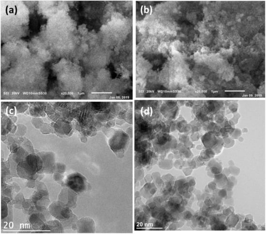 (a) SEM micrograph of iron-doped cerium oxide nanoparticles doped with 10% iron; (b) 20% iron; (c) HRTEM micrograph of iron-doped cerium oxide nanoparticles doped with 10% iron and (d) 20% iron.