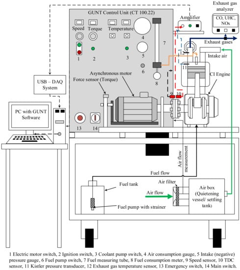A single cylinder diesel engine of power rating 5.5 kW at 3500 rpm connected to an asynchronous motor (Model TFCP 132SB-2) and equipped with the necessary instrumentation for engine performance evaluation was used in the experiments. Figure 3 shows a schematic representation of the engine experimental setup. More details about the experimental setup can be found in Reference [43]. The test rig (Model GUNT-CT100.22, Motorenfabrik Hatz GmbH & Co. KG, Ruhstorf, Germany) consisted of a compression ignition (CI) engine of the technical specifications presented in Table 1. The asynchronous motor was used for starting the engine and for torque measurement.