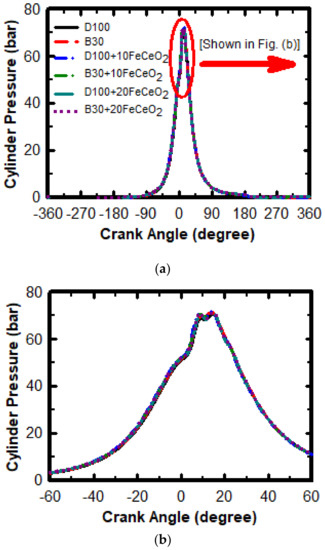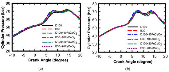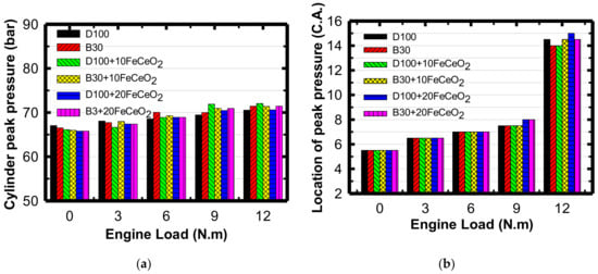 Figure 6a,b show the cylinder peak pressure () and the corresponding crank angle locations (), respectively. The cylinder peak pressure and its location are determined from the cylinder pressure profiles. From the figure, it can be observed that the peak pressure for B30 is comparable with that of D100 at all engine loads and it generally increases with addition of nanoparticles. The location of the peak cylinder pressure is delayed for higher engine loads, indicating that a greater amount of the injected fuel is burned during the diffusion combustion stage. Figure 6b shows that the fuel type has minimal effect on the location of the peak cylinder pressure.