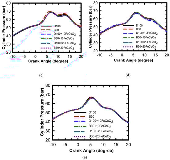 Figure 5 shows the average cylinder pressure profile at a constant engine speed of 2000 rpm and varying engine loads. At a constant engine speed, the in-cylinder air motion as well as frictional losses of the engine remain the same, hence, any change in the in-cylinder pressure data could be attributed to either the change in the amount of injected fuel or fuel type. Generally, higher engine loads imply a larger amount of injected fuel. Hence, the peak cylinder pressure increases with engine load as can be seen in Figure 5a–e. It was also observed that the peak cylinder pressure increases with the addition of nanoparticles possibly due to enhanced combustion process. A greater improvement in cylinder pressure was observed at higher engine loads owing to enhanced combustion at higher temperatures.