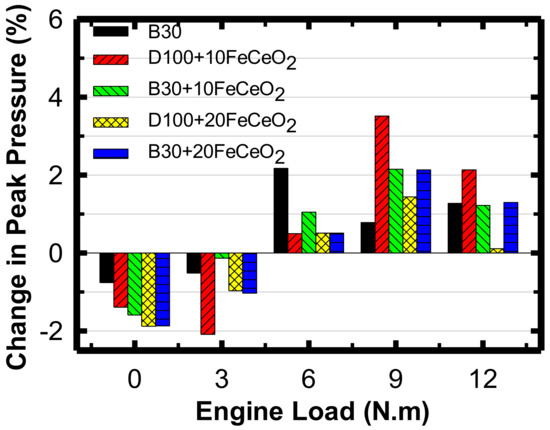 The change in peak cylinder pressure for different fuel conditions relative to mineral diesel base fuel is shown in Figure 7. At low engine load, lower peak cylinder pressure is recorded for B30 and fuels with nanoparticles. However, at high engine loads, the peak cylinder pressure was higher for D100 by up to 3.5%, owing to an improved combustion process at higher engine loads.
