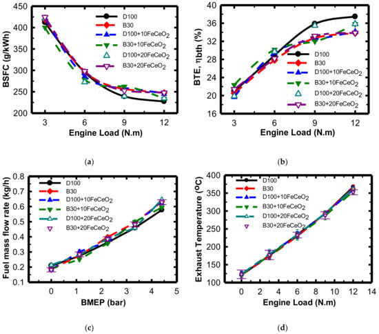 Engine performance parameters include quantities such as the BSFC of the BTE. Figure 8a–d shows the BSFC, BTE, fuel mass flow rate, and exhaust gas temperature () for engine operation at 2000 rpm with varying load and fuel conditions. For all the tested fuels, the BSFC reduced while the BTE improved with the increase in engine load. This could be attributed to the remarkable improvement in the fuel combustion quality at high engine load as seen in Figure 8a and b. It was also observed that the BSFC was lower for the fuel blend of B30 with 10 FeCeO2 nanoparticles in low-to-medium loads and comparable to D100 at high loads. Consequently, the BTE for the blend was higher than that of D100 in low-to-medium loads and slightly lower at high loads. The improved BSFC and BTE of the fuel blend with nanoparticles could be attributed to enhanced combustion processes due to the catalytic effect of the nanoparticles [25]. The B30 fuel blend without nanoparticles shows higher BSFC and lower BTE compared to D100, possibly due to the lower calorific value of the biodiesel fuel, which implies that a larger quantity of the fuel was burned to generate equivalent power as D100 [8]. The trend for the fuel mass flow rate, as seen in Figure 8c shows a lower mass flow rate for B30 blend with 10 FeCeO2 nanoparticles at low and medium loads, while the flow rate was comparable with D100 at high loads, indicating better fuel consumption with addition of nanoparticles. Figure 8d shows minimal difference in the exhaust gas temperatures for different fuel conditions, except at high load where the nano-additive enhanced fuels show relatively lower exhaust temperatures.