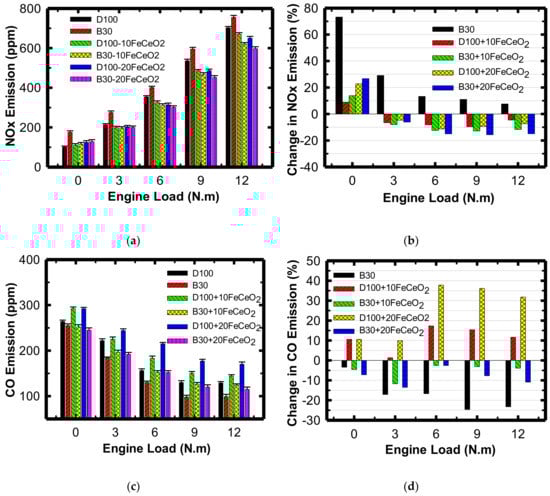 Figure 9a–d shows the engine emissions of NOx and CO, and the change in emission quantity for fuel blends relative to D100 at varying loads and a constant engine speed of 2000 rpm. The HC emissions were noticed to be unaffected by the fuel type or additive.