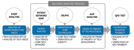 The multiple analysis process illustrated in Figure 1 is composed of three phases—patent analysis, Delphi, and AHP—and is capable of building up data of higher objectivity by including all the quantitative-qualitative analyses. Subsequently, a QFD test is conducted for the feasibility verification of the constructed technology roadmap.
