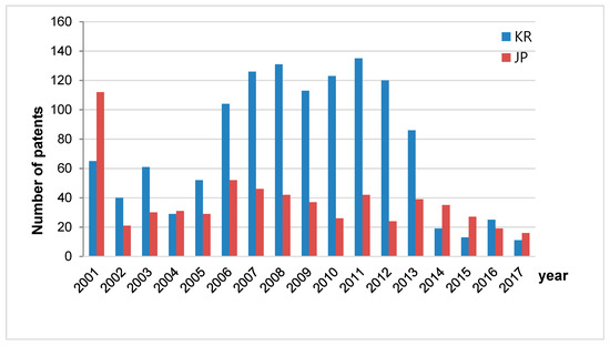 Also, from Figure 3, it can be observed that the average annual numbers of patents are 14, 33, and 20 for the periods 2001–2004, 2005–2013, and 2014–2017, respectively. It seemed that the average annual number of patent registrations increased during the period 2005–2013, as the government encouraged R&D in functional building materials through relevant regulations. However, the average number of patents for the period 2014–2017 was reduced, as the products were applied to the field. On the other hand, in Japan, where there are no separate regulations for functional building materials, the number of patents did not change significantly. As a result of the patent analysis, we observed that the number of patent registrations was related to the implementation of new institutions and to market demands.