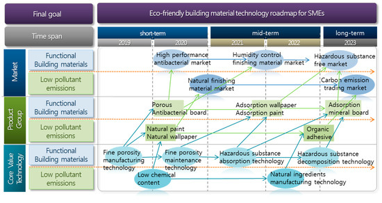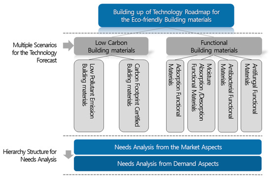 However, in the case of the environmental industry, the utilization of a technology roadmap is not as frequently carried out as in other industries. This is because the environmental industry has more aspects related to social contribution, rather than profit making, prompting the governments of many countries to politically support technological development, also providing research funding at governmental level [8]. Although these government-led Research and Development (R&D) investments have the positive function of leading the environmental industry with consistency and stability, it occasionally becomes a factor in hindering the utilization and research of a technology roadmap, thus delaying the changes required owing to market demands. Moreover, the manufacturers of Korean eco-friendly building materials are deficient in terms of technological innovation capabilities that could enable a flexible reaction to changes in the environment of such technological developments. In particular, the eco-friendly building material sector has a structural characteristic that makes it difficult to comprehend the market needs that are fundamental for future forecasts, in that the purchasers (construction companies) and the users (inhabitants) are different. Because of such industrial and structural characteristics, R&D in the eco-friendly building material industry has been led by the government, rather than by the market, and the technology roadmap has been defined not by the demands of the market, but by the direction of government policies. However, with the improvement in quality of life and the growth in market requirements for such highly functional building materials that require specific technology, the creation of a technology roadmap that systematically reflects the definition of future core technologies and provides a developmental timeline is urgently required [9].