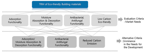 Consequently, it was observed that, among the functions required by customers in the eco-friendly building material market, humidity control demonstrated the highest order of priority, followed by the demand for building materials with resistance to bacteria and fungi. These items could be categorized under adsorption, moisture absorption, and desorption, antibacterial, antifungal building materials, which confirmed that the development of technologies for these types of functional building materials seem imminent. The results of importance and order of priority analyzed with respect to the correlation between the technology evaluation and the customers’ demand demonstrates higher scores for building materials with moisture absorption and desorption and antibacterial and antifungal functions than the adsorption function among functional building materials, which reflects the market demand for the development of building materials that can handle climate changes towards heightened humidity.