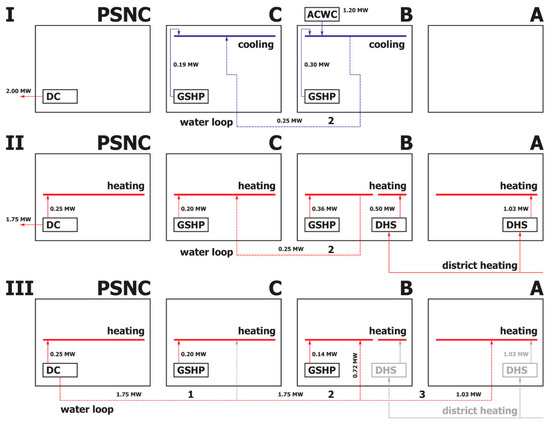 Main heat fluxes for PSNC and PUT A, B and C buildings, (I)—summer period, (II)—winter period with water loop #2, (III)—winter period with #1, #2 and #3 loops, DHS—district heating substation, ACWC—air cooled water chiller.