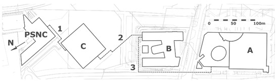 In the neighborhood of the PSNC building, there is a PUT campus. The PSNC building is thus located near three main buildings: the Faculties of Architecture and Engineering Management Building (building C), Faculty of Chemical Technology Building (building B) and Library and Lecture Center Building (building A), all only at most 400 meters away. This can be seen in Figure 3. Buildings A and B are equipped with air cooled water chillers and coupled with heating substations connected to the Poznan district heating network, with a contracted power demand of 1027 kW and 500 kW respectively. Building B is also equipped with 360 kW heating power Ground Source Heat Pumps (GSHPs). In building C, a nearly zero-energy one, cooling and space heating is provided by a low temperature thermally activated building system and heat is generated only with the GSHPs.