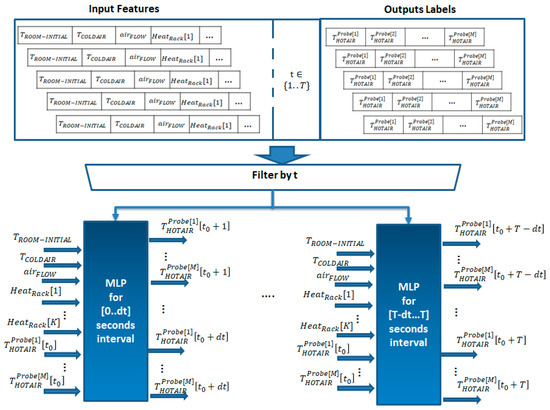 Because we need predictions for every second in the forecasting interval, the developed infrastructure has MLP modules trained with data filtered for a specific second ( in Figure 7) to compute temperature predictions of the probes for that time instance. Each of the T MLPs has as input the parameters (, , , {}) describing the initial situation of the simulation and additional parameters describing the temperature probe values at the beginning of the prediction window . Each MLP module aims at predicting the temperature of the key points representing the probes deployed in the server room for every timestamp in each time interval of the form where . Thus, for computing the all the hot air probe temperatures at second t in the future, the index of the interval has to be computed as the integer part of the ratio , and the temperatures will be predicted by the MLP as its outputs: